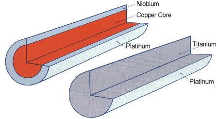 In reviewing the properties of these materials (Table 1), it becomes quite clear that if a combination of these materials was developed which exploits only the advantages, the result would be a superior anode material. The most logical combination of materials would include the use of a platinum outer layer, very thin due to cost, a layer of niobium beneath the platinum to allow for a dimensionally stable anode, and a copper core for both conductivity and economy. The niobium layer should be heavy enough to withstand normal mechanical handling.